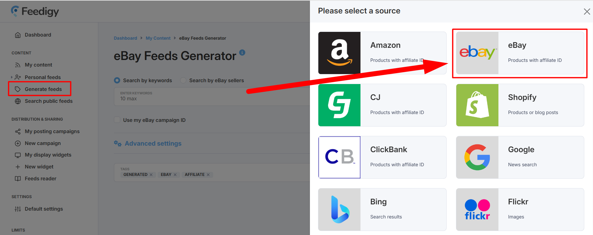 If you already have a Feedigy account, you need to press Generate feeds in the left navigation sidebar and select eBay as a content source: