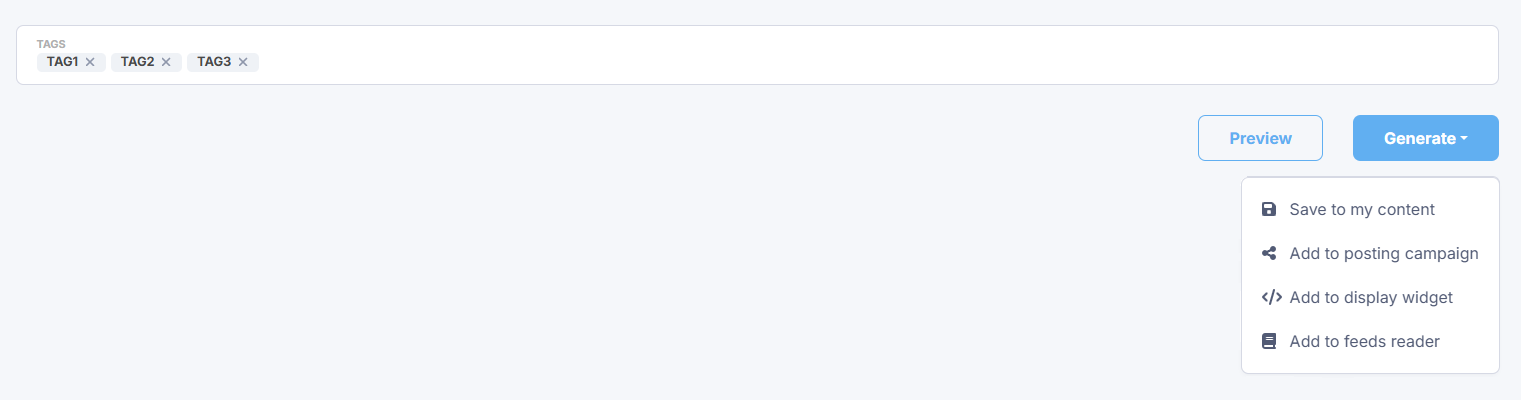 Also, you can specify tags for your feed that will appear in the My content table where all your generated feeds are automatically saved. This will help to search or filter your feeds there.