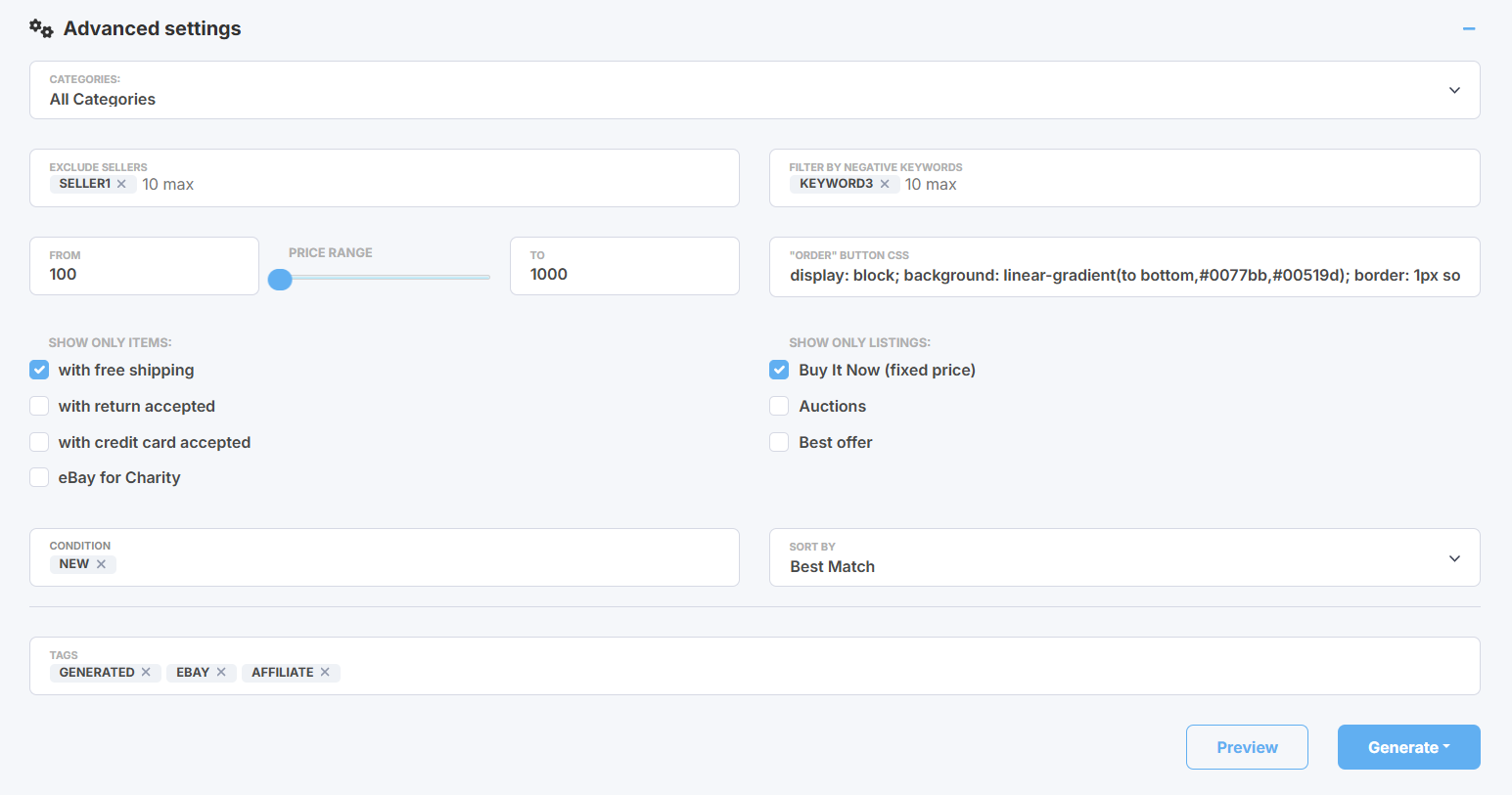 eBay Feeds generator has Basic and Advanced settings. Advanced settings are optional and are used for more targeted search. You can use only basic settings to start searching for eBay products.