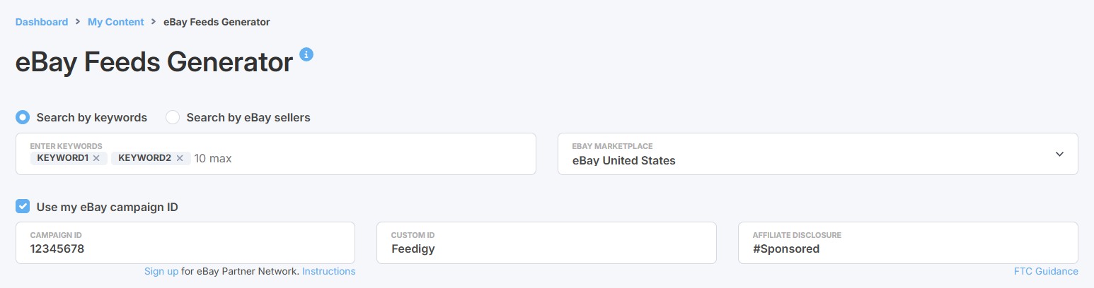 We will generate a separate eBay product feed for each specified search keyword or eBay seller in the basic settings.